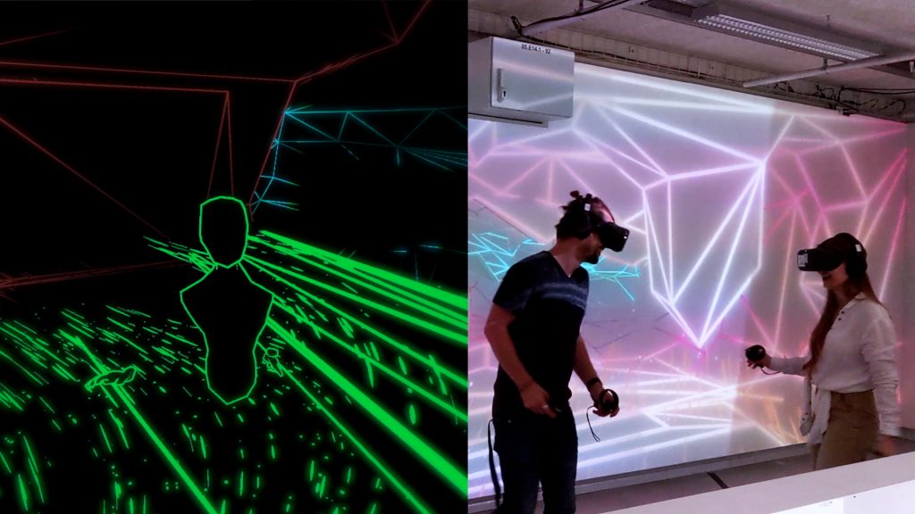 Virtual Echolocation is a multiuser VR experience where sound impulses from the users’ microphones are transformed into a dynamic visual interpretation of their environment.