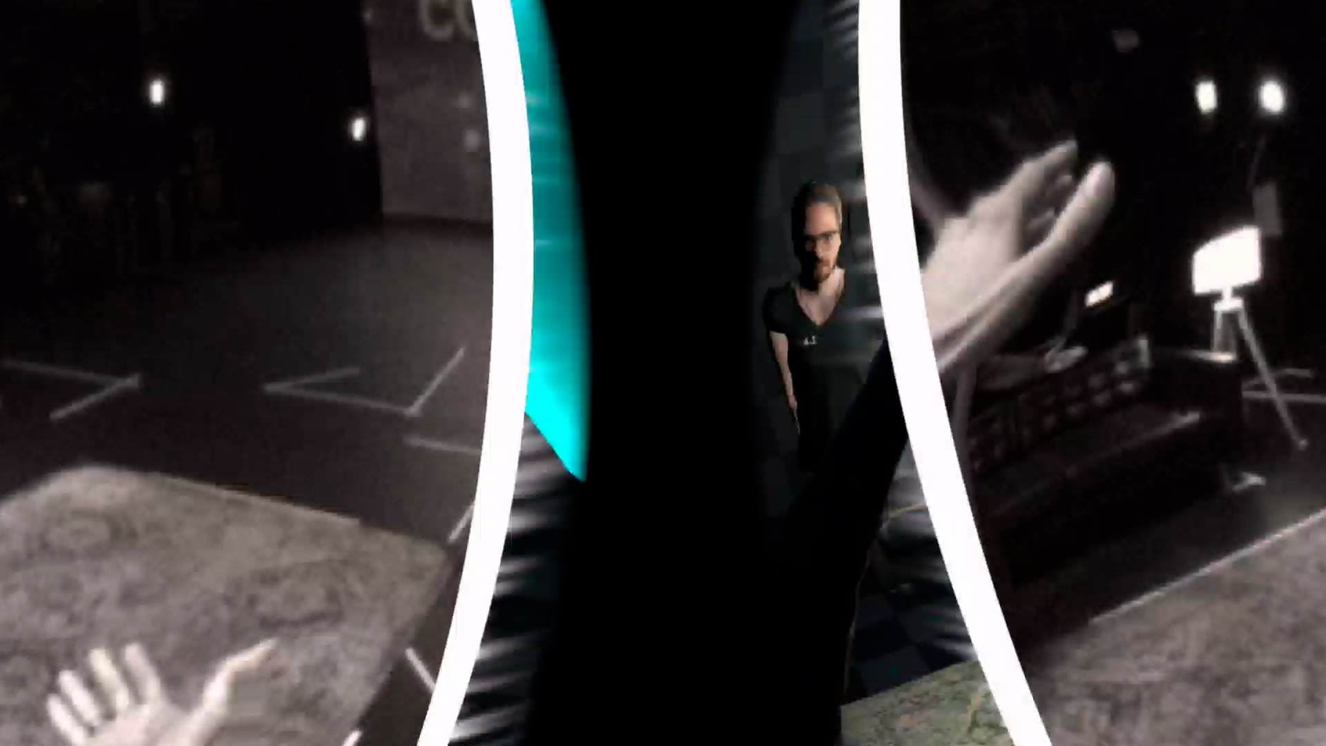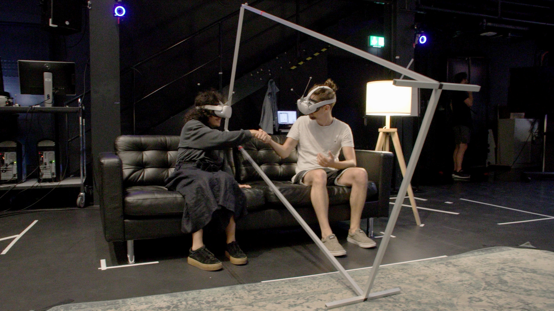 These experiences are partly built on scanned objects, a volumetrically captured human figure, and the passthrough feature of the Oculus Quest 2. The headset’s black-and-white camera streams the user’s real surroundings, which can be selectively integrated into the virtual world through doors or windows. The passthrough’s appearance can be modified with filters, color shifts, or contrast adjustments. Visitors see each other as a neural-generated 3D avatar reconstruction of the experience’s creator. Haptic feedback plays a key role: touchable objects must precisely match their digital counterparts. While the sofa is fixed, the physicaly existing portal can be moved. Users can also feel each other’s presence through shared gestures: handshakes, shoulder taps, or playful interaction, all inside this layered virtual world.