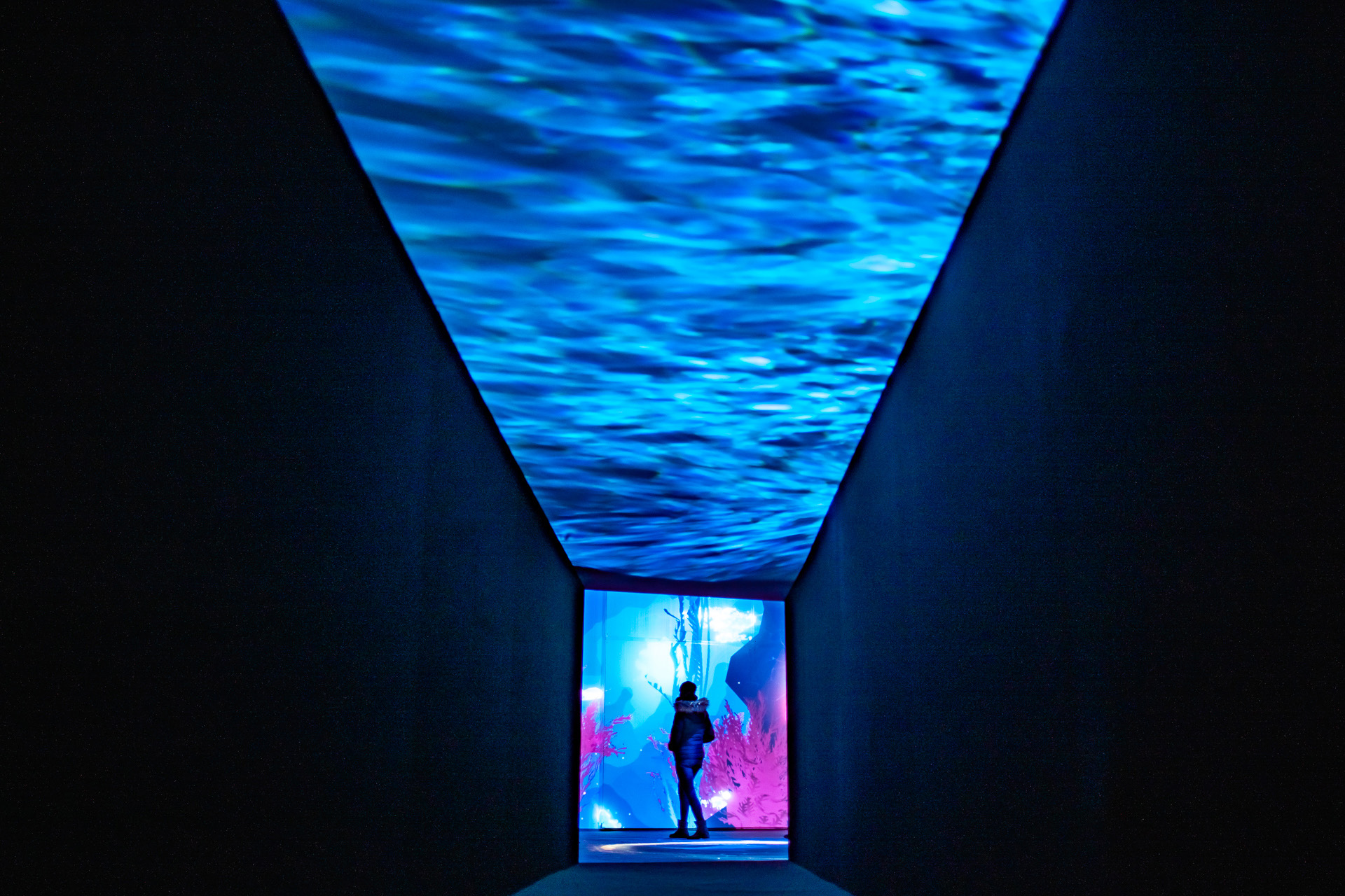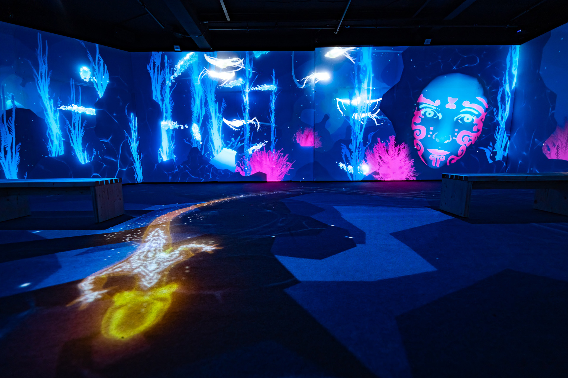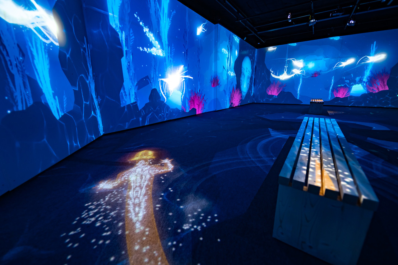 The highlight of the Tamina Lumina Winter 2018 exhibition in Bad Ragaz was an interactive room on whose walls and floor a fantastic underwater world was projected. Visitors were able to touch the walls and interact with the virtual world thanks to laser barriers placed on them. With the help of depth cameras, the position of the people in the room was detected and fantasy-like creatures on the floor moved around the spectators.